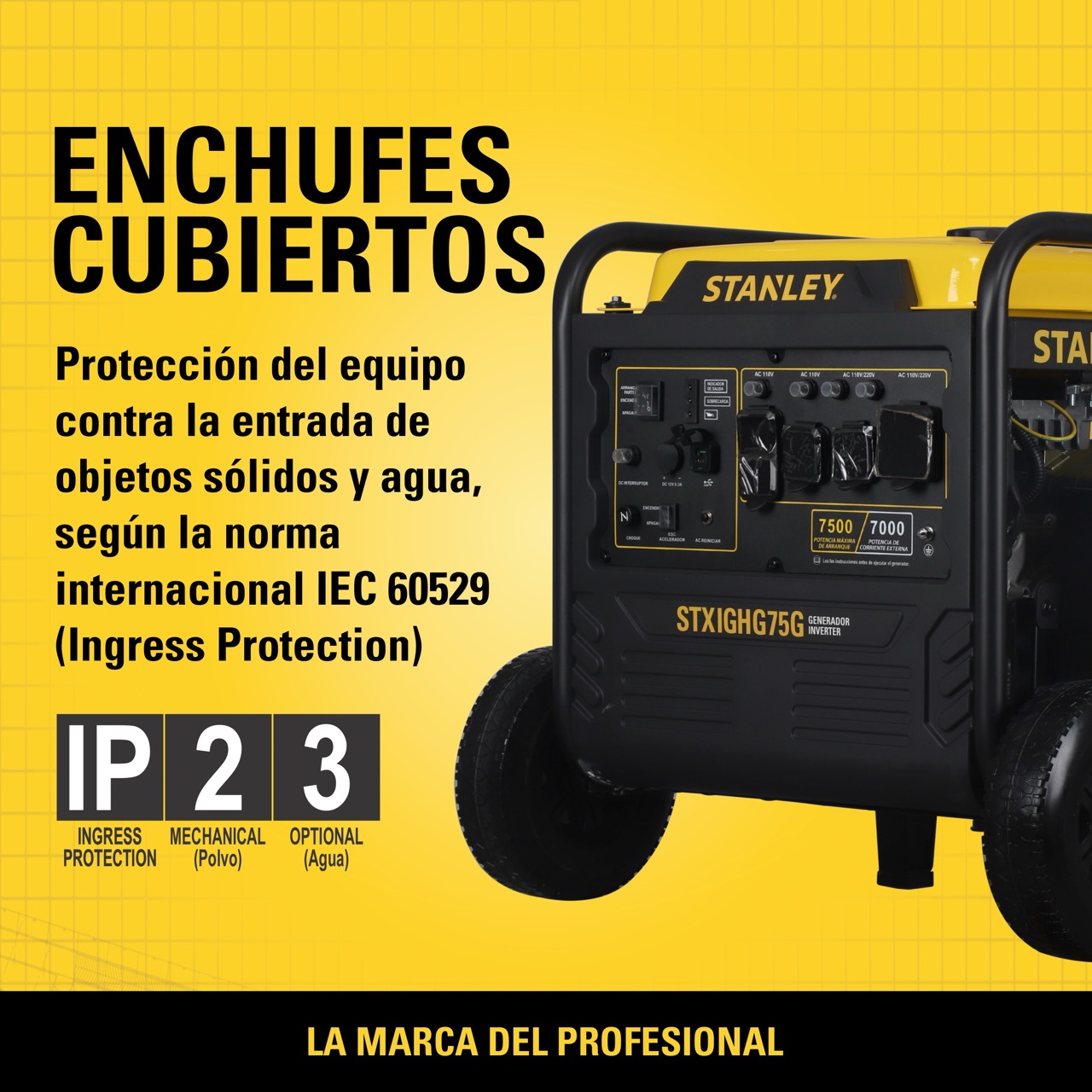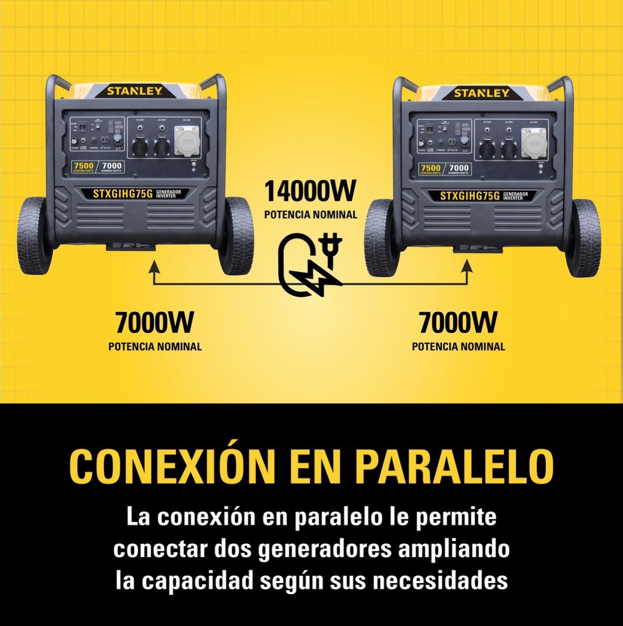 El generador inverter STANLEY® STXGIHG75G ofrece alto rendimiento con 7000W nominales y 7500W máximos, ideal para obras, eventos y respaldo energético doméstico. Su tecnología inverter (THD ≤2%) garantiza energía estable para equipos electrónicos sensibles. Incorpora un motor 4 tiempos de 420 cc, modo ECO y hasta 10 horas de autonomía con bajo nivel de ruido (68 dB). Incluye sensor de monóxido de carbono, protección por sobrecarga y alerta de bajo aceite. Su diseño robusto con batería, ruedas, múltiples salidas AC/DC y conexión en paralelo asegura potencia, portabilidad y máxima versatilidad.
